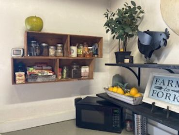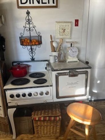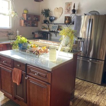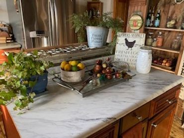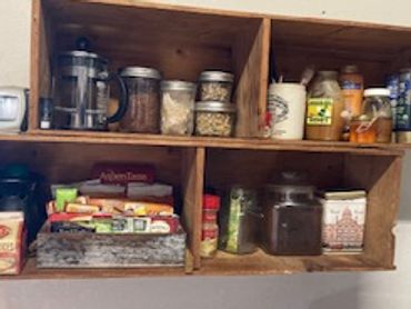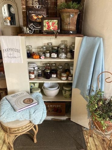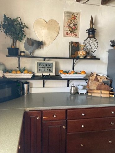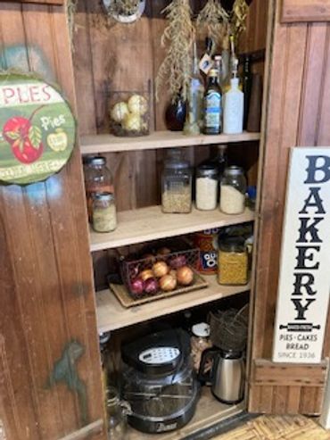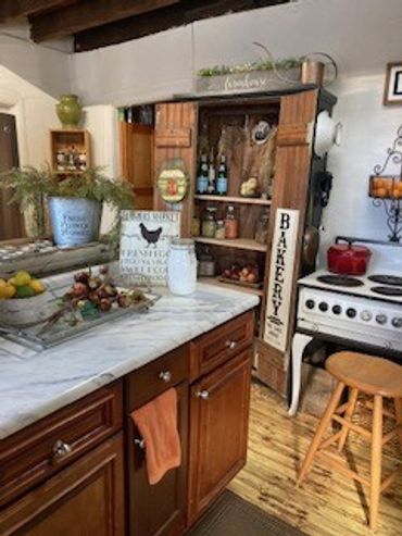 Un-kitchens ususally have few, if any, upper cabinets over countertops and some might not have any built-in cabinets at all. Often, instead of cabinets, they'll have open shelves or use pieces of furniture for storage. In my un-kitchen I have an antique armoire that I use as a pantry. Artwork is often times used in the un-kitchen decor, and sometimes there's even some lounge seating. I have a small area to sit and enjoy looking up recipes in my cookbooks, as well as a nook with an antique table for mail, keys, etc.
